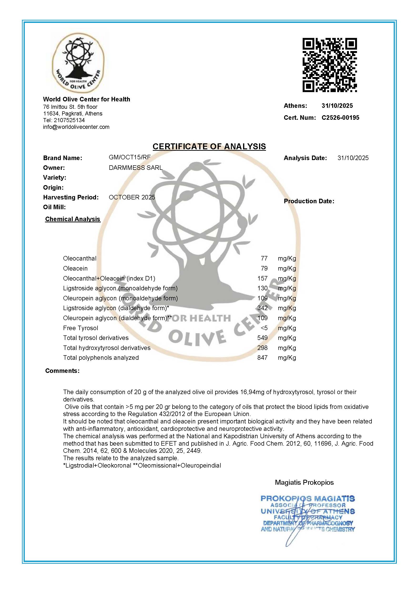 Analyzed at the University of Athens, Greece, 2025 Limited Edition of Darmmess has been awarded the Silver Standard of Excellence for High-Phenolic Extra Virgin Olive Oils, with total polyphenol levels ranging between 500 and 845 mg/kg.